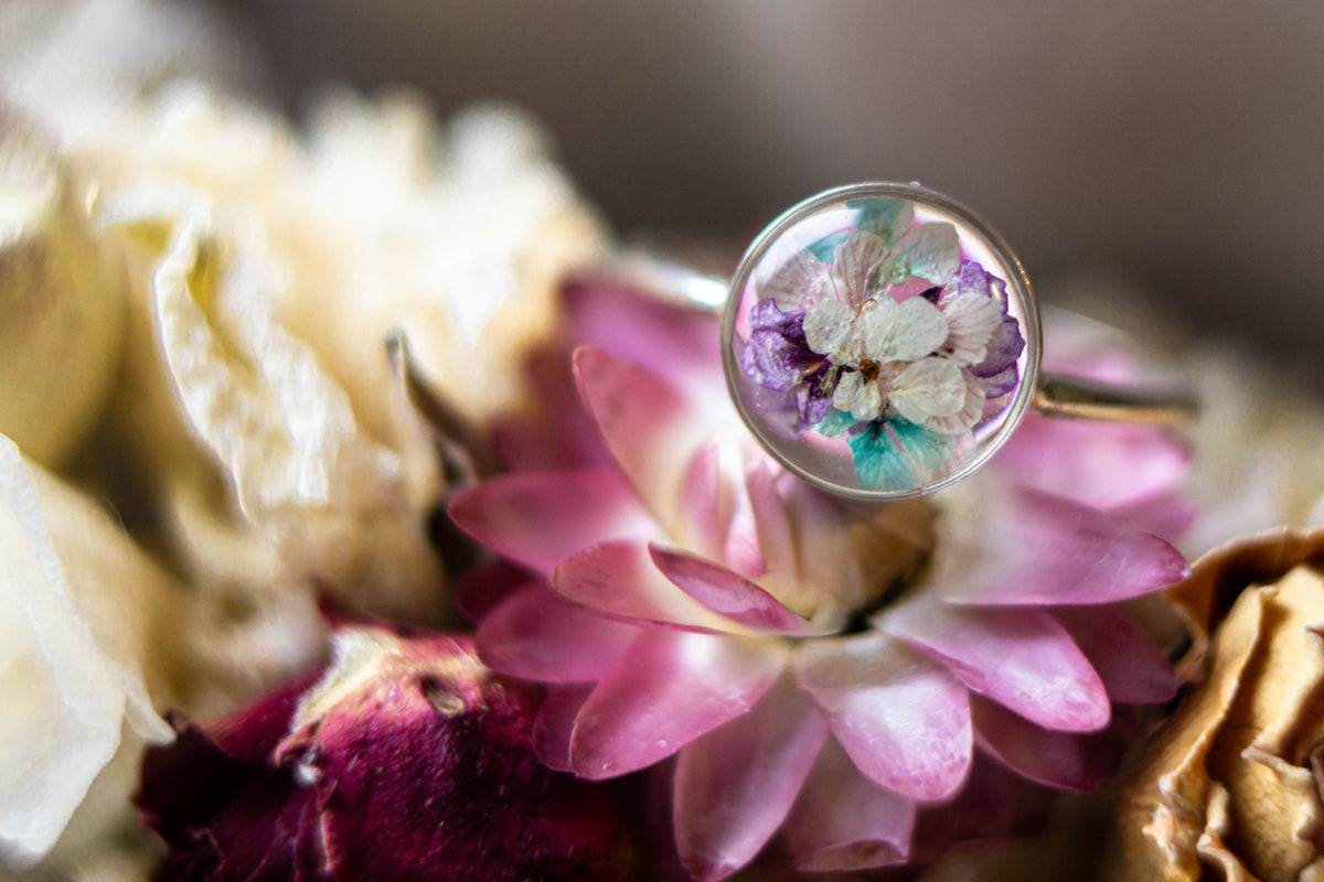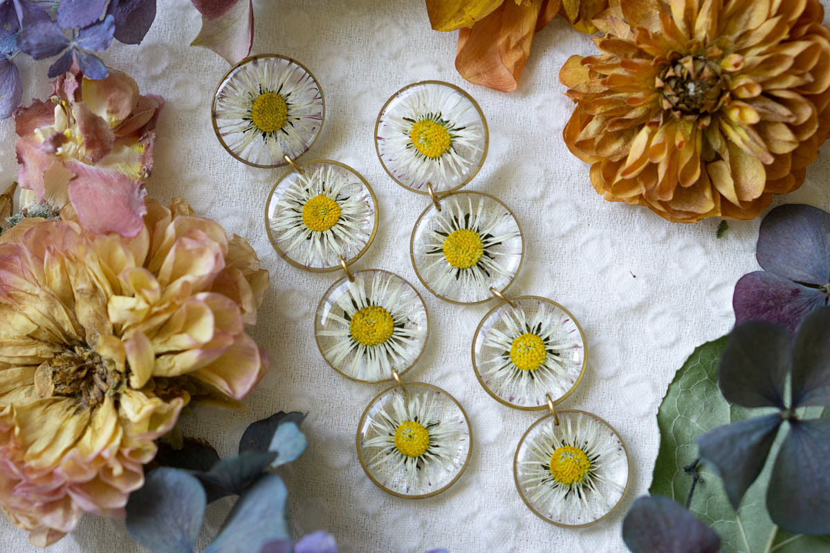 At Floraever, we prioritize sustainability, ensuring that every specimen we use is wild or home-grown, sustainably harvested, dried, and pressed. To achieve our unique color palettes, many of the florets we use are first stem-dyed. Each flower is then meticulously placed and encapsulated in multiple fine layers of a jewelry-grade resin.